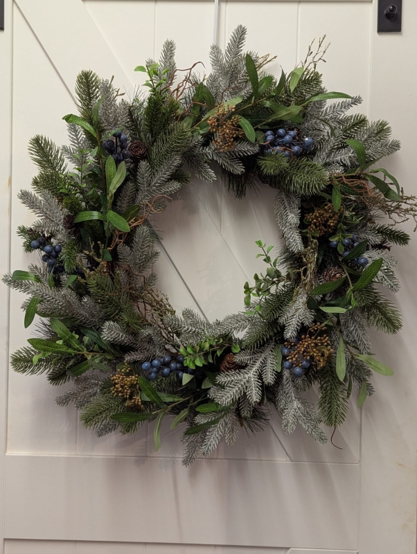 A beautiful Christmas wreath with assorted subtle sparkling foliage and blue berries
